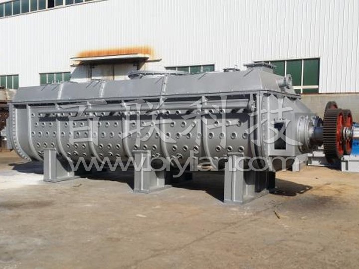 空心軸上密集排列著楔型中空漿葉,熱介質(zhì)經(jīng)空心軸流經(jīng)漿葉。單位有效容積內(nèi)傳熱面積很大,熱介質(zhì)溫度從-40℃到320℃,可以是水蒸汽,也可以是液體型:如熱水、導(dǎo)熱油等。間接傳導(dǎo)加熱,沒有攜帶空氣帶走熱量,熱量均用來加熱物料。熱量損失僅為通過器體保溫層向環(huán)境的散熱。楔型漿葉傳熱面具有自清潔功能。物料顆粒與楔型面的相對運動產(chǎn)生洗刷作用,能夠洗刷掉楔型面上附著物料,使運轉(zhuǎn)中一直保持著清潔的傳熱面。漿葉干燥機(jī)的殼體為Ω型,殼體內(nèi)一般安排二到四根空心攪拌軸。殼體有密封端蓋與上蓋,防止物料粉塵外泄而充分發(fā)揮作用。